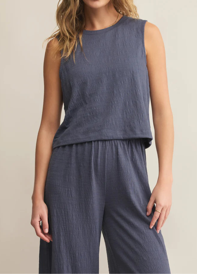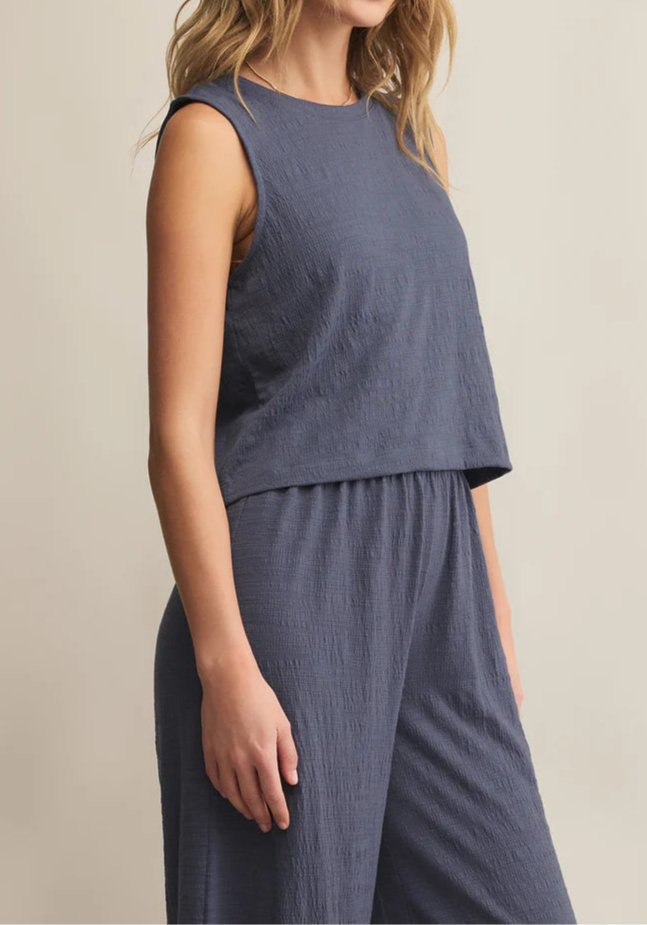 A laid-back essential with a textured twist, this sleeveless crewneck top hits at the waist and channels effortless cool. Its slub knit fabric and muscle tank style make it the perfect pairing for high-waisted denim or layered looks.