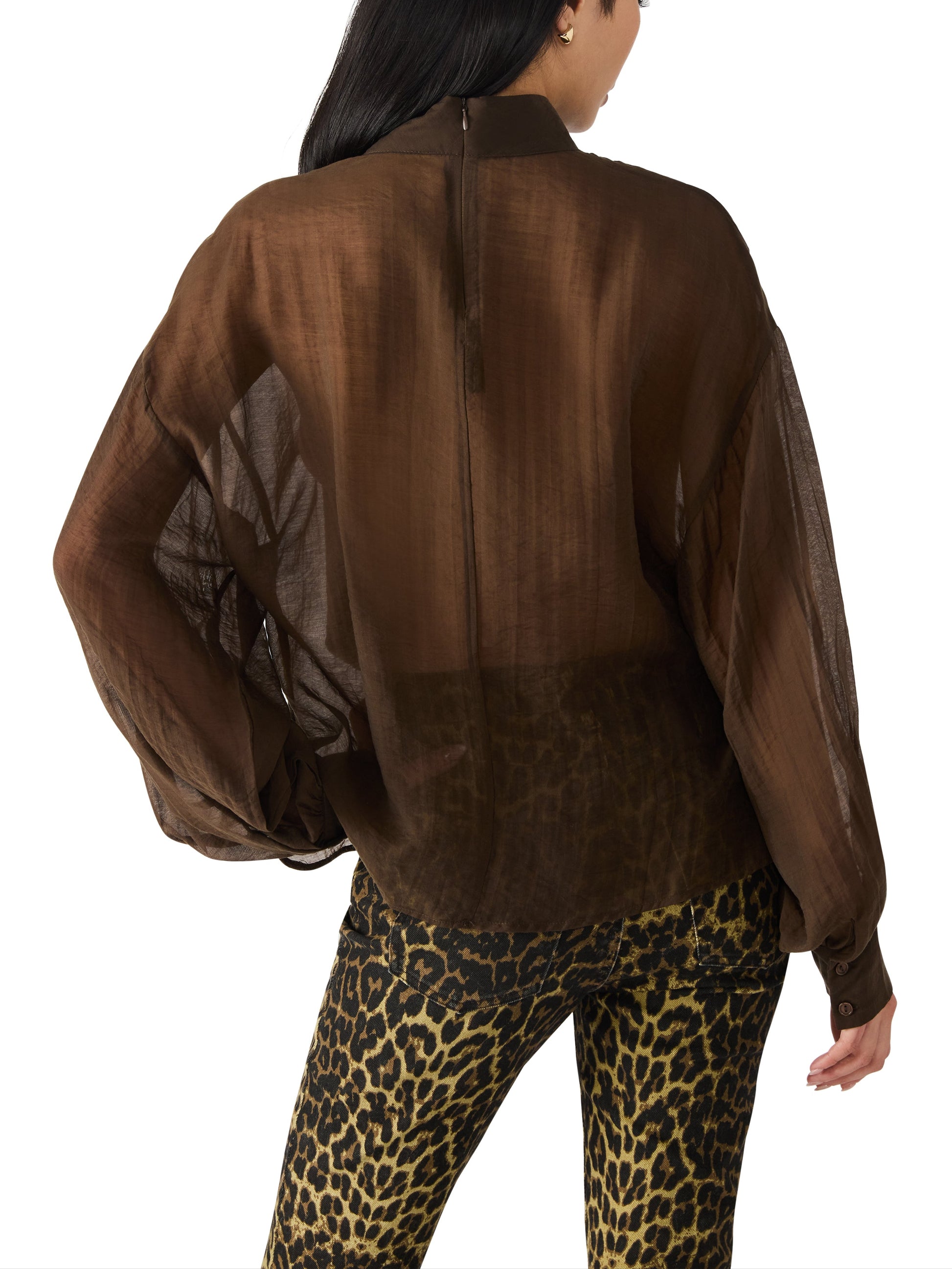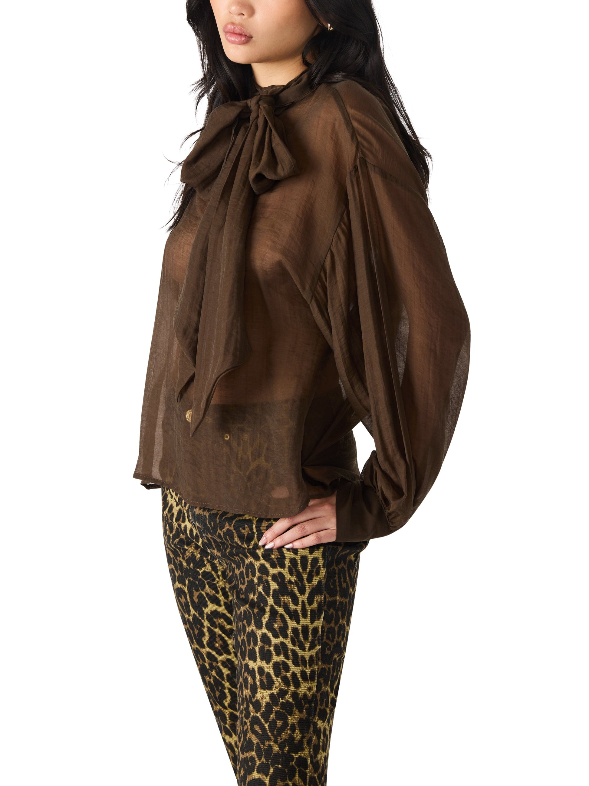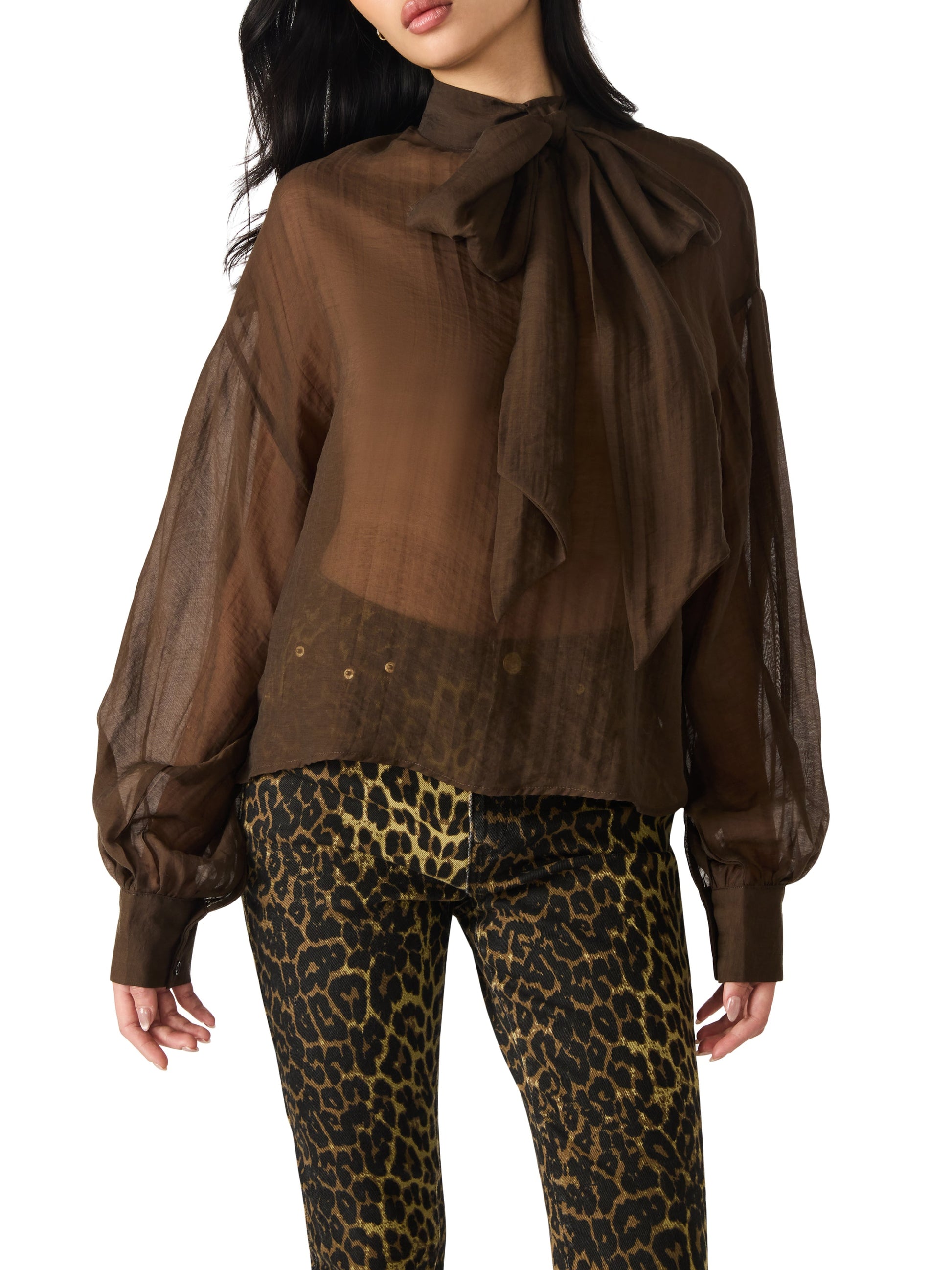 This sheer top offers a relaxed fit with a convenient back zip closure. Crafted from lyocell and nylon, it features an elegant bow tie neck scarf, combining comfort and style effortlessly. Ideal for occasions welcoming in the fall season.