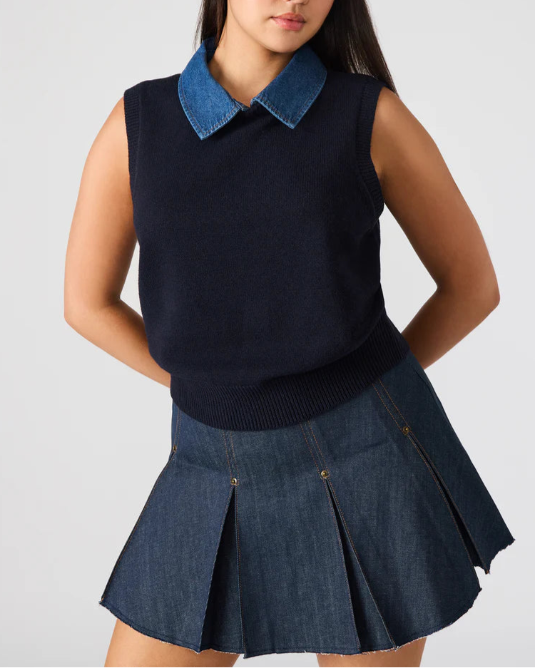 Elevate your layering game with this sweater vest top. Crafted for versatility, this sweater vest offers a refined knit texture and a multi-tone design that seamlessly complements both casual and polished outfits. It's tailored fit ensures comfort while adding a sophisticated dimension to your wardrobe essentials. Ideal for transitional weather, it pairs effortlessly with shirts or blouses for a modern, expert-curated look.