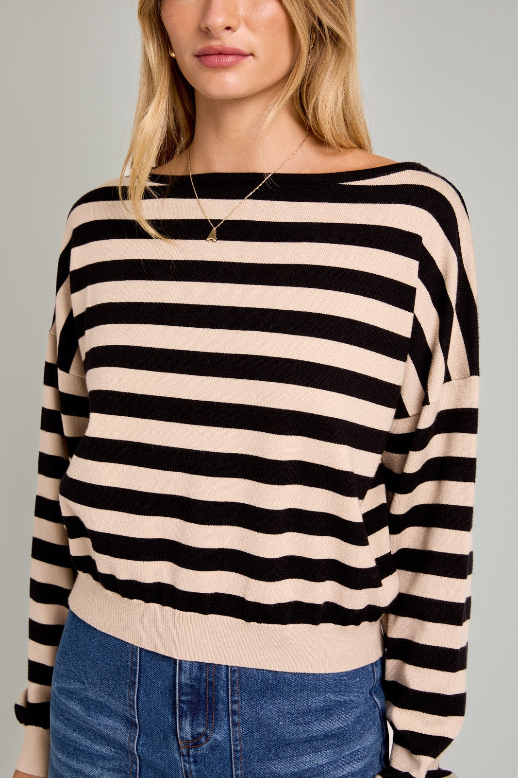 Stay warm and stylish with our "PROVIDE" sweater. Featuring a classic boat neck, long sleeves, and chic beige and black stripes, this sweater is perfect for any occasion. Whether you're headed to work or out for a night with friends, this sweater will keep you cozy and fashionable.