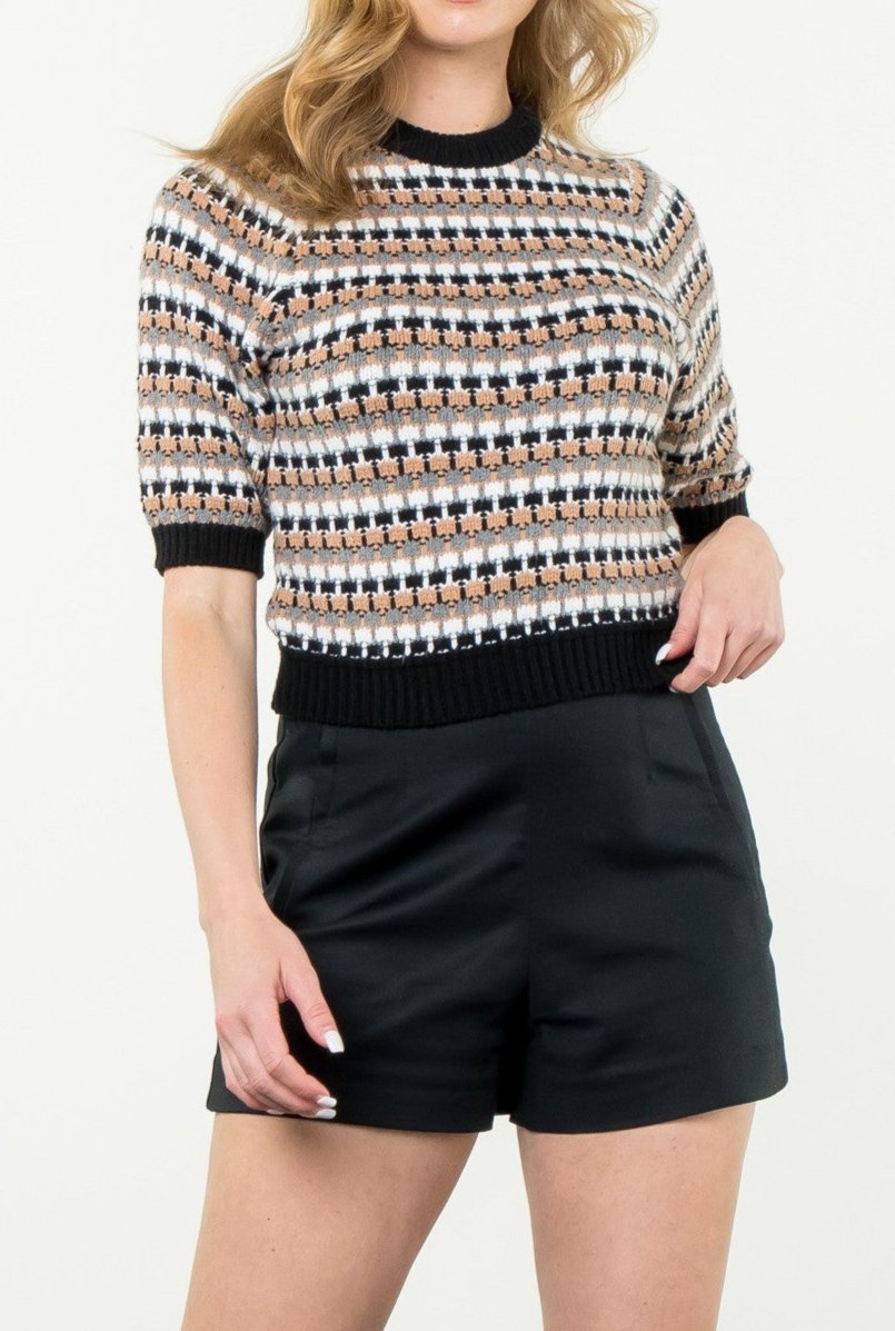 The "Promise Keeper" sweater is perfect for any occasion. With its short sleeves, knit design, and multicolor pattern, it's both stylish and comfortable. Stay warm and in fashion with this versatile sweater.