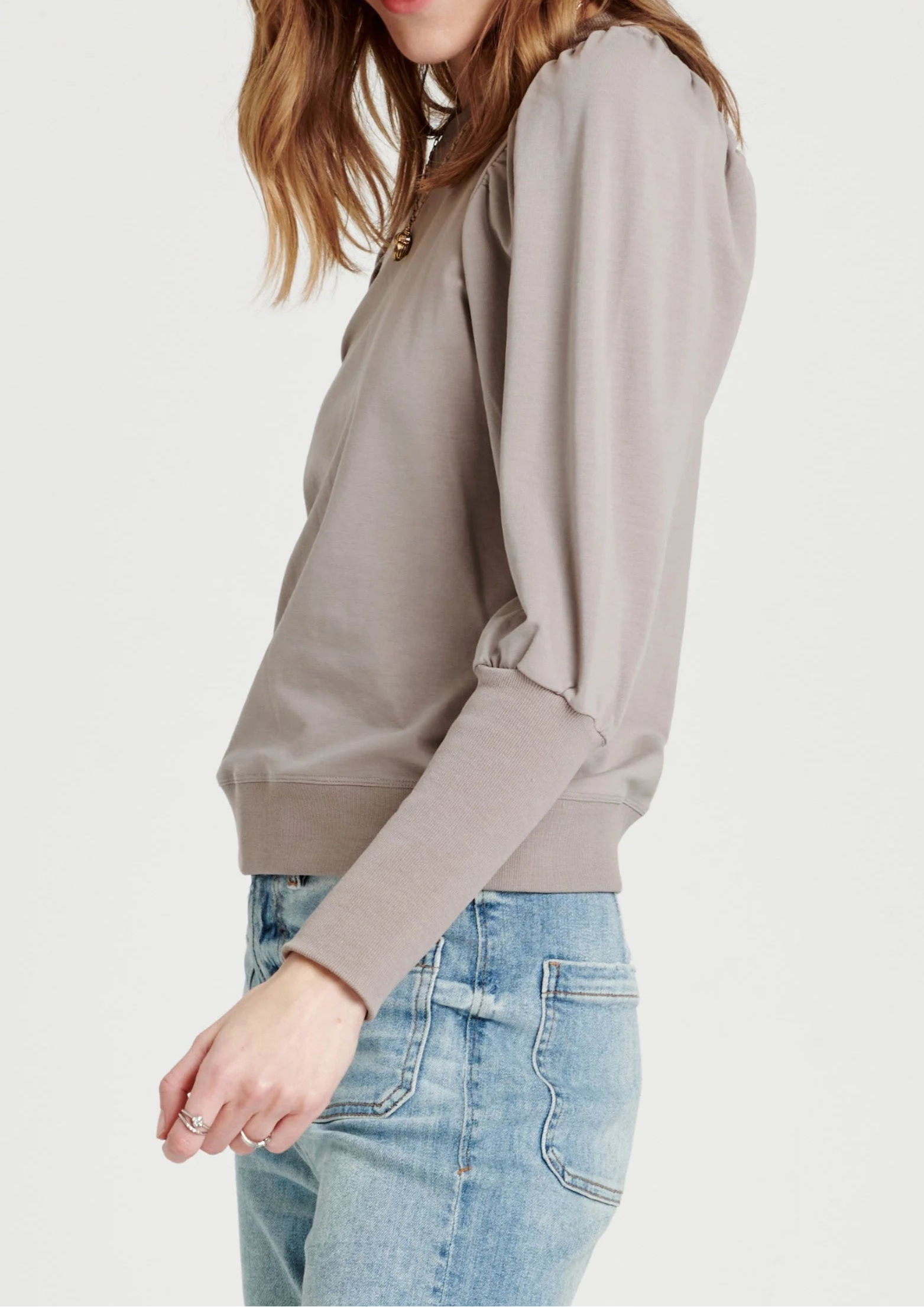 Puffy long sleeve sweatshirt, crew neck with rib "V" insert, cuff, waistband finish. Leisure classics versatile all you do... the effortless carefree comfort! Solid color knit on relaxed fit.