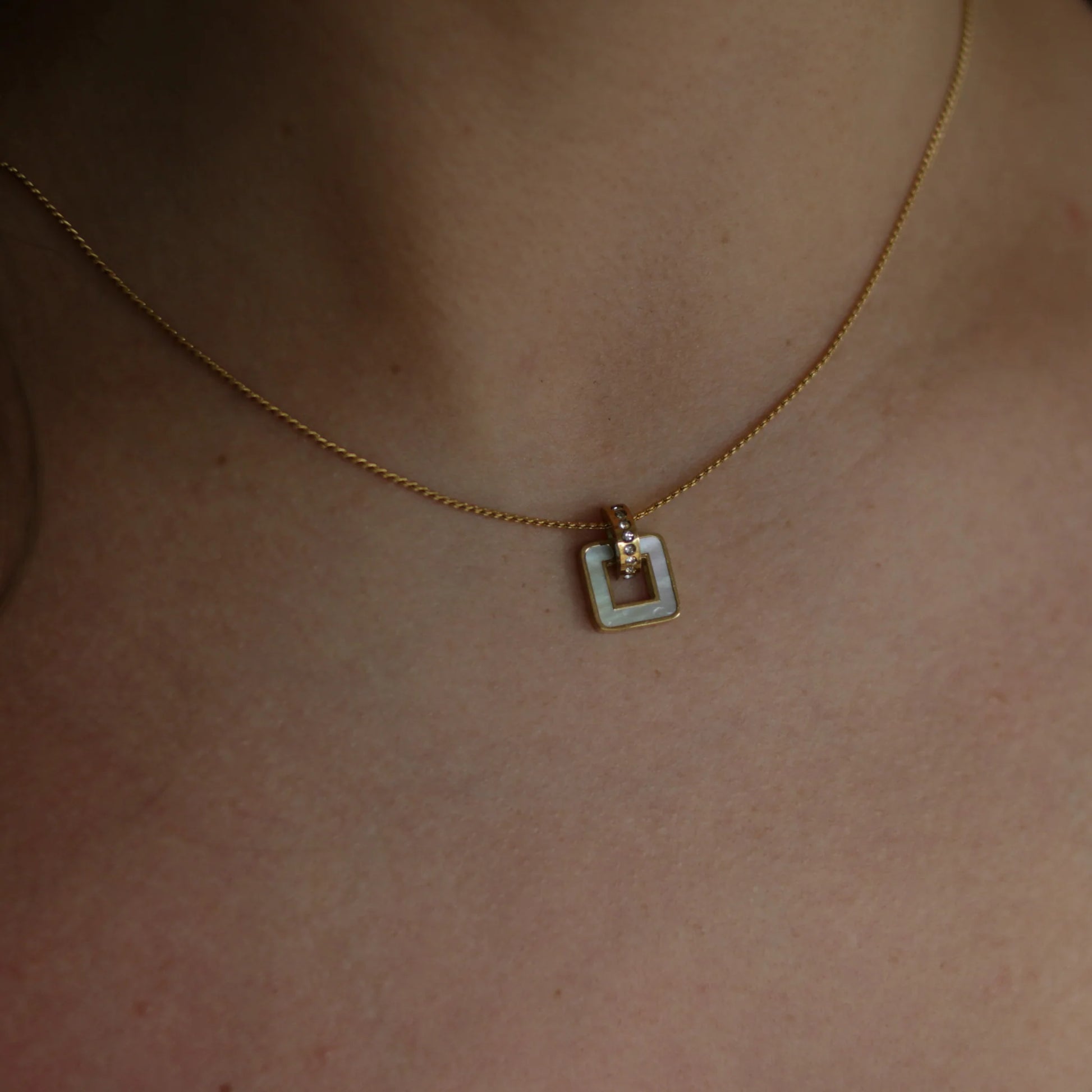 This dainty necklace features a small mother of pearl square pendant on gold chain.