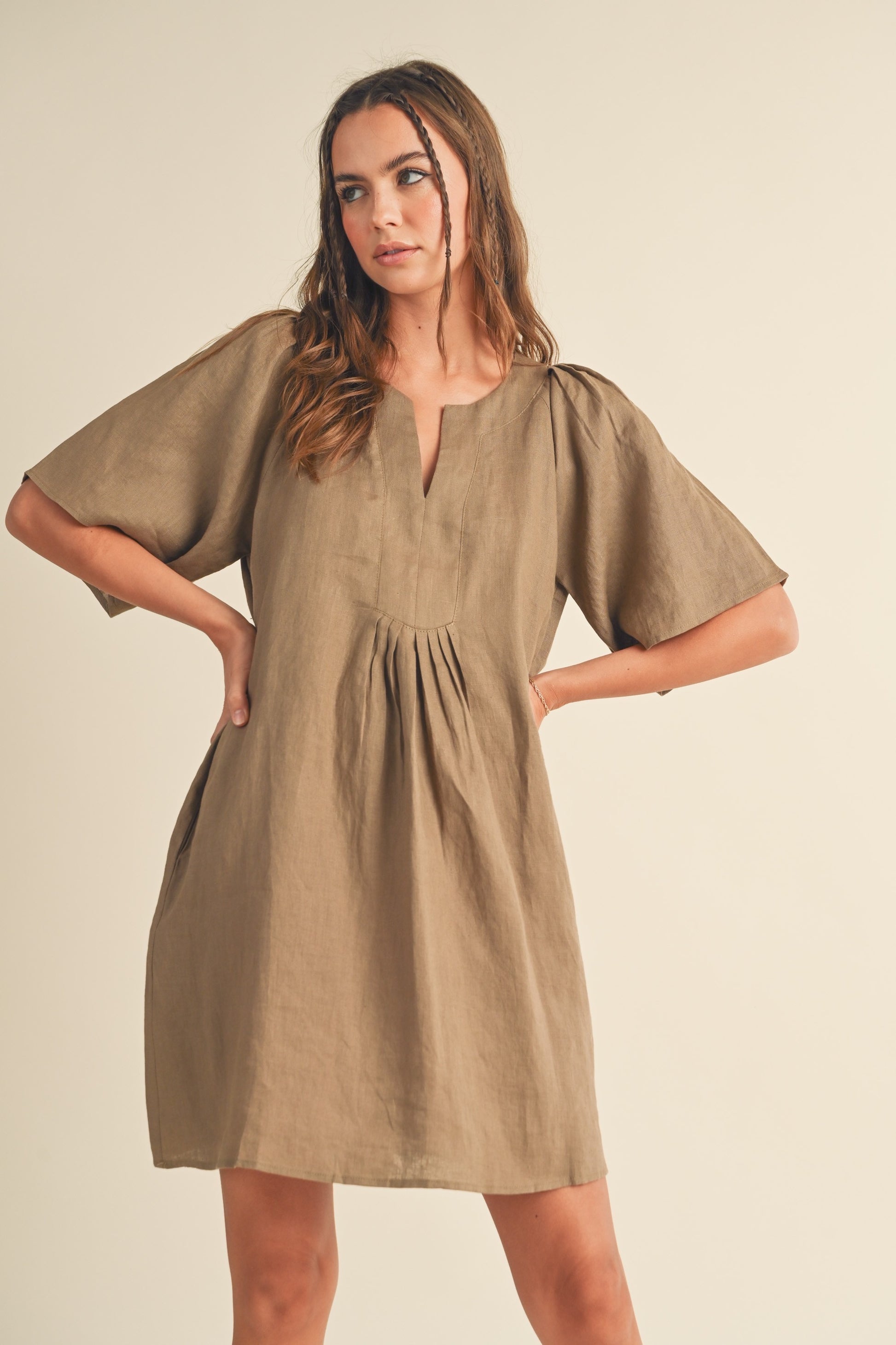 Introducing our "Nothing to Fear" dress, featuring a V-neck and elegant pleated detail. Crafted from luxurious linen, this dress exudes sophistication and timeless style. Embrace your inner elegance and fearlessly make a statement in this beautiful piece.