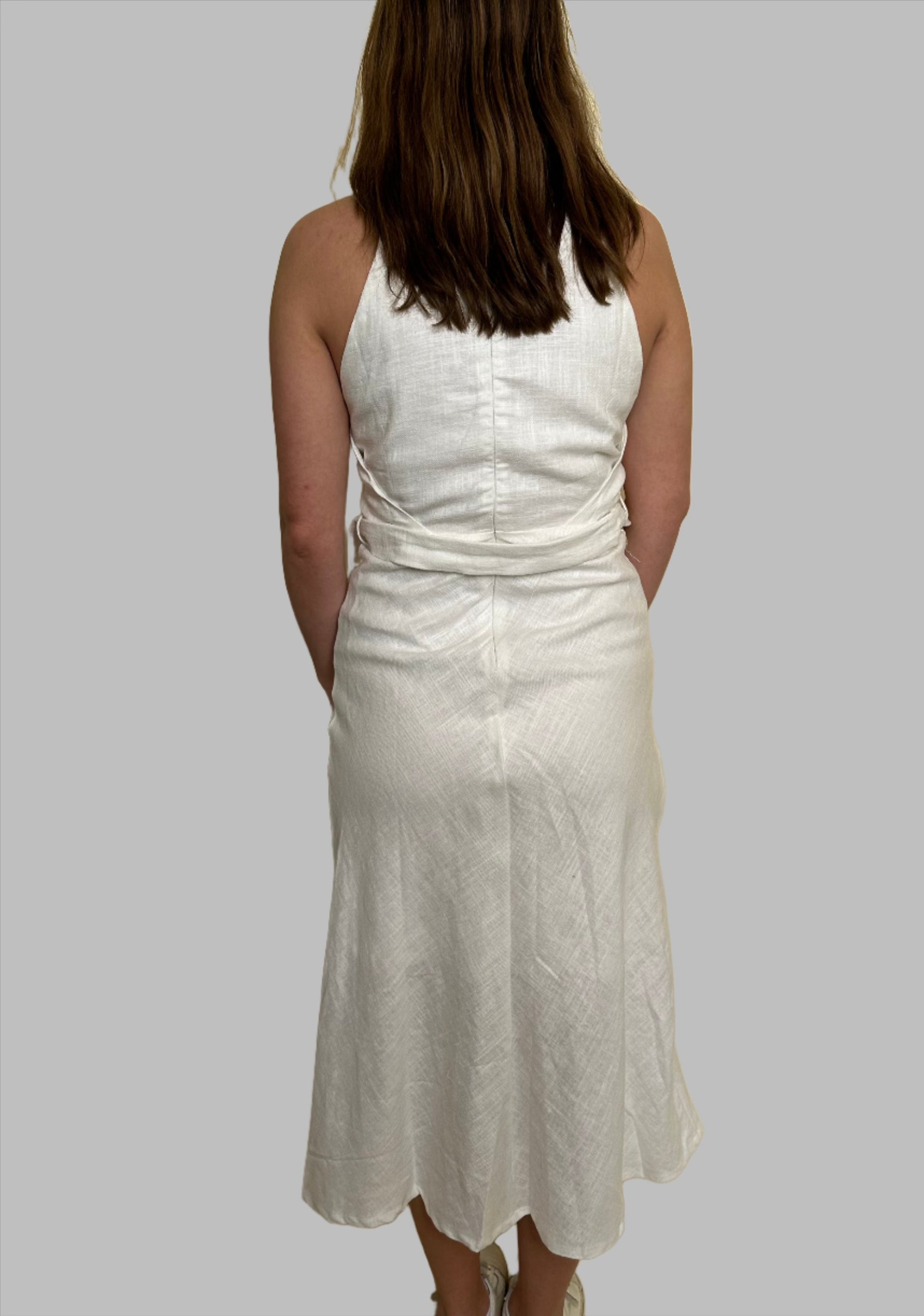 Elevate your style with our "Highest Confidence" dress. This linen, v-neck dress features a sleeveless design and midi length for a classic, elegant look. The belted waist adds a flattering touch to this white dress, making it the perfect choice for any occasion. Exude confidence and sophistication with every step.