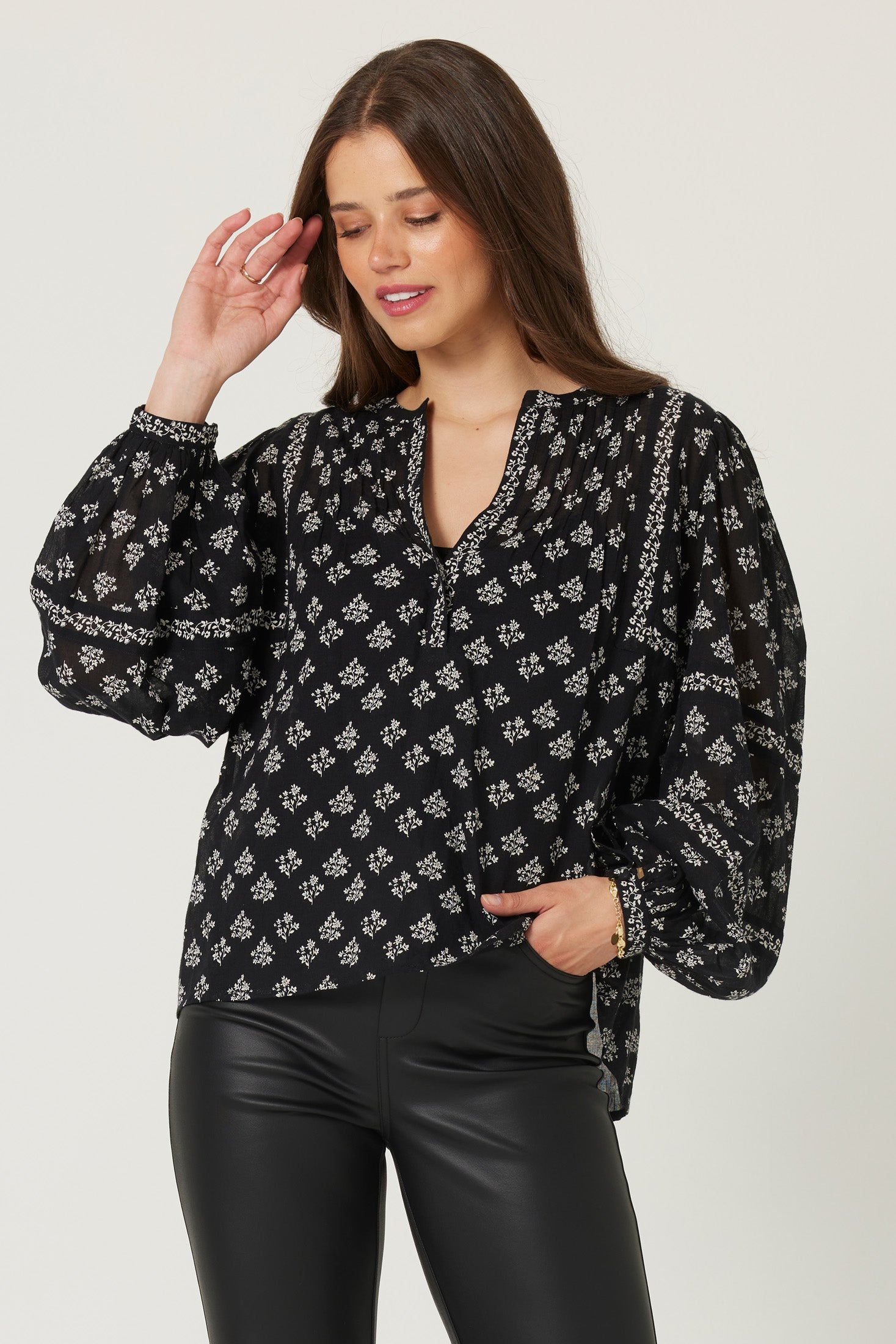 Introducing the Valley Springs Top, a timeless piece to add to your wardrobe. Crafted from airy fabric with pin tucks and a classic v-neck, this top features an exquisite paisley print for an elegant touch of artistry. The picture looks like it's black, but it is navy! An exquisite addition to any wardrobe, the Valley Springs Top is perfect for showcasing your sophisticated style.