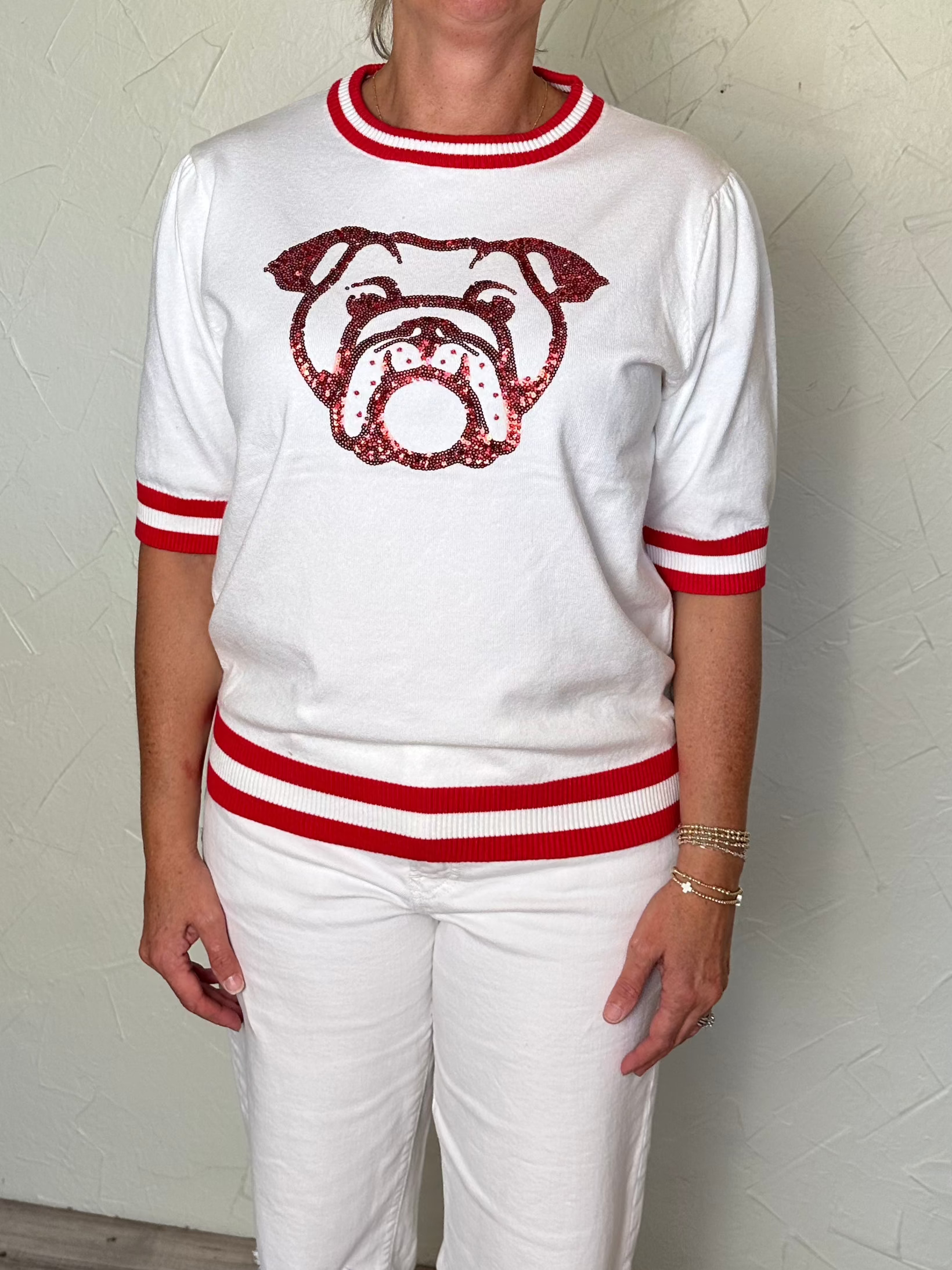 Show off your team spirit with our Georgia Bulldog sweater top! Made from lightweight material, it's perfect for game day or everyday wear. With the iconic bulldog logo this top is a must-have for any football fan. Go Dawgs!