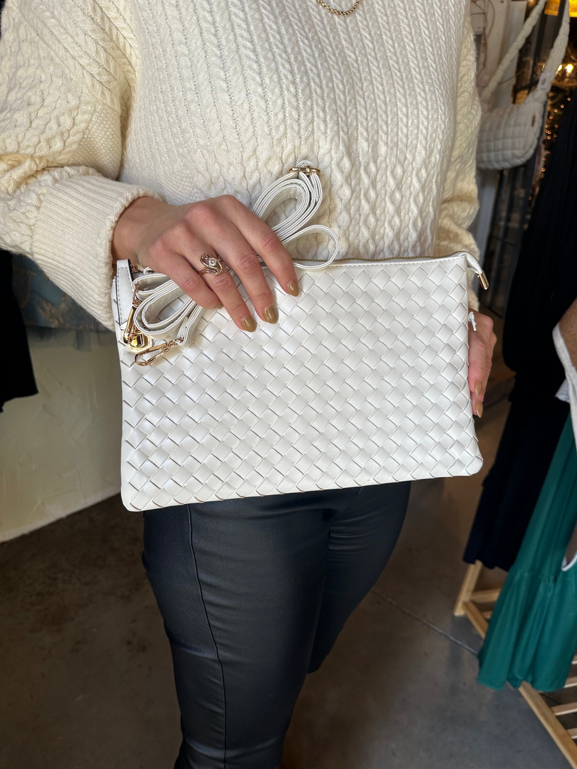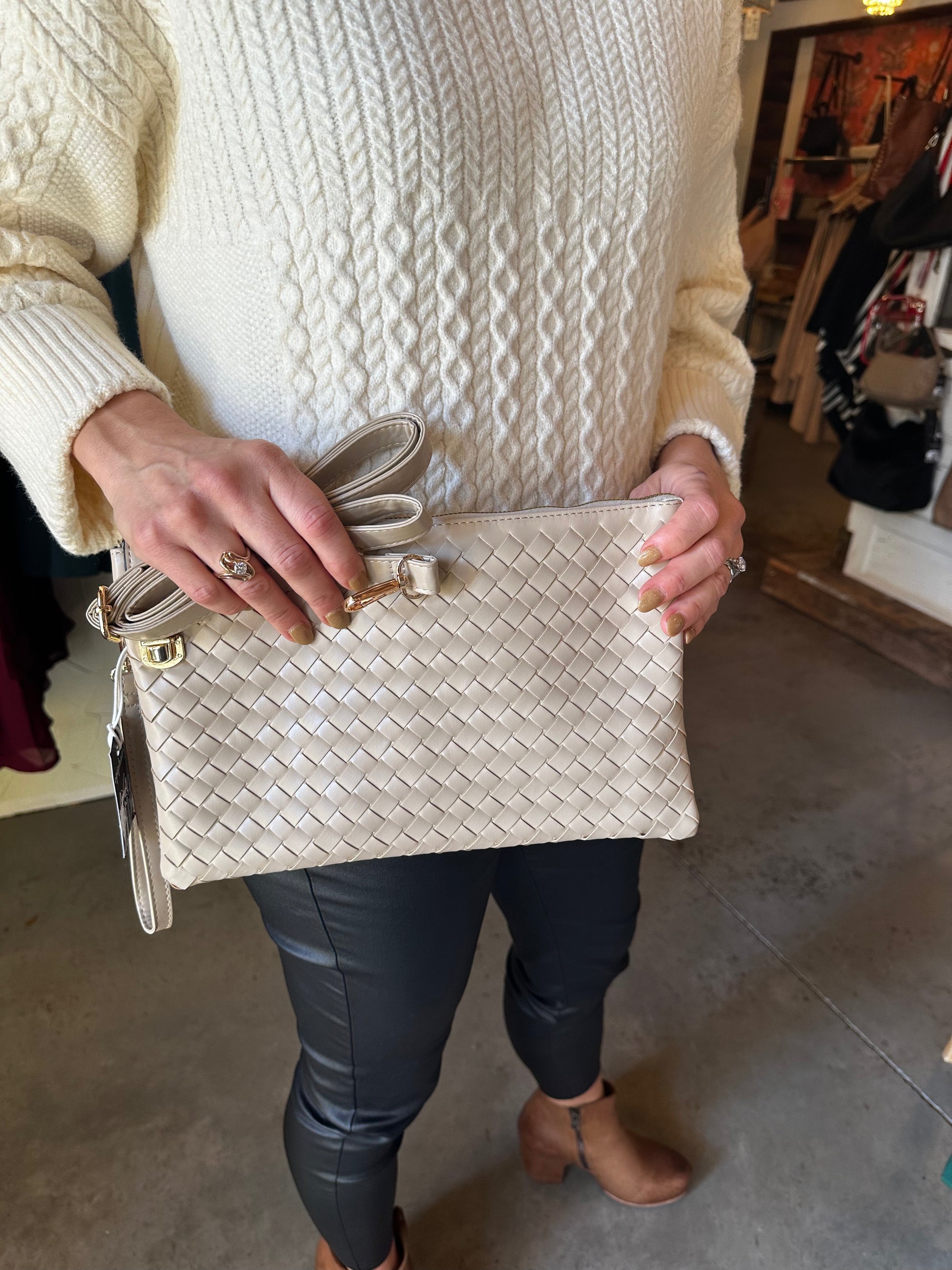 Stay organized and stylish with our woven leather crossbody. Available in ivory, beige, or black, this crossbody features three spacious compartments and a removable strap for versatile wear. Keep your essentials close and stay chic with this must-have accessory.