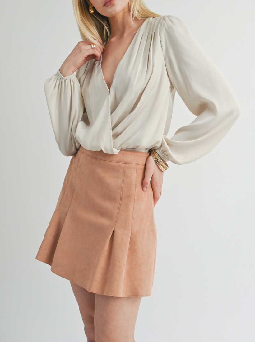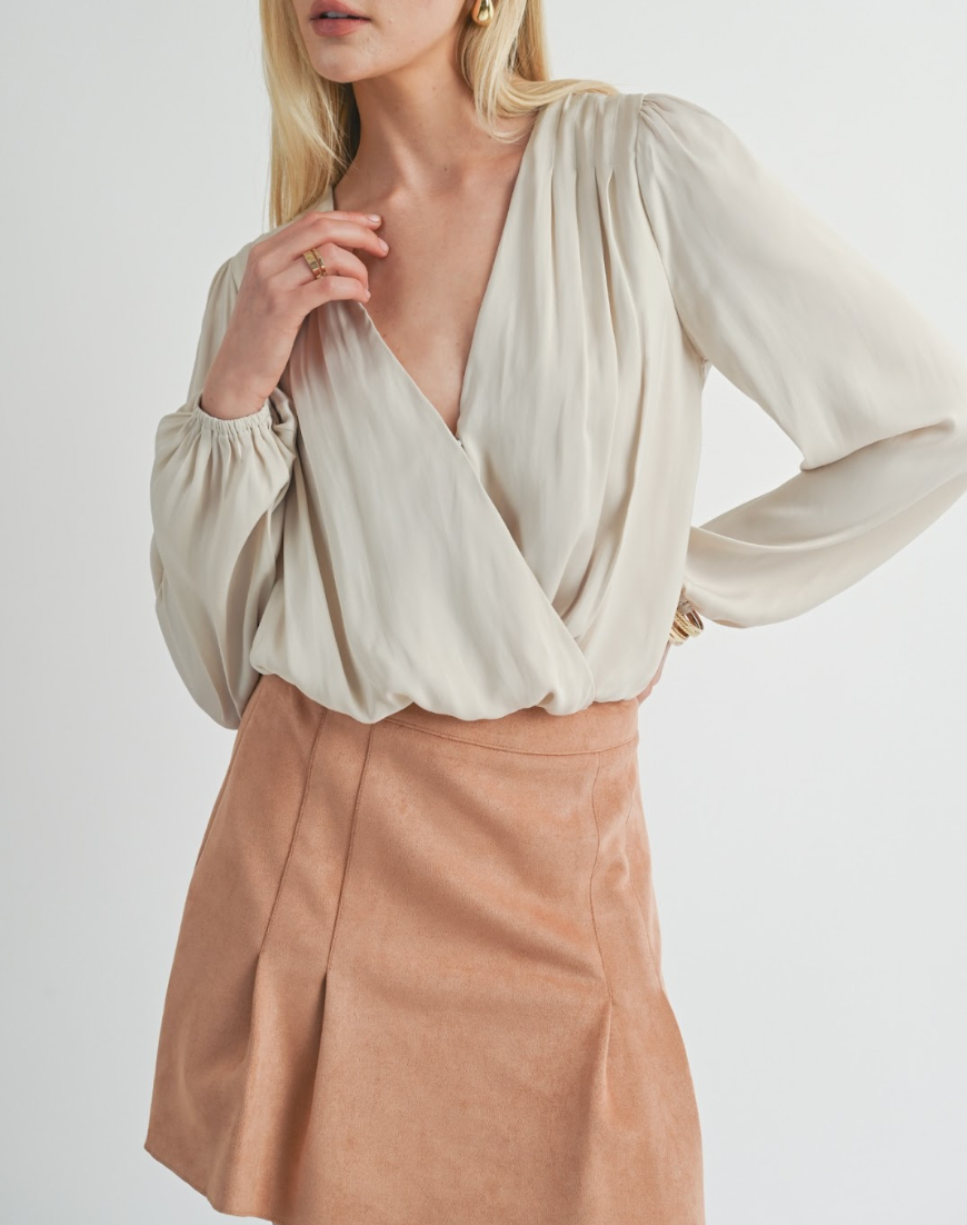 This "JOY IN THE WORD" bodysuit features a pleated design, a flattering v-neckline with snap closure, and stylish balloon sleeves. It's the perfect combination of comfort, fashion, and versatility. Experience joy in both your wardrobe and your daily life with this must-have piece.